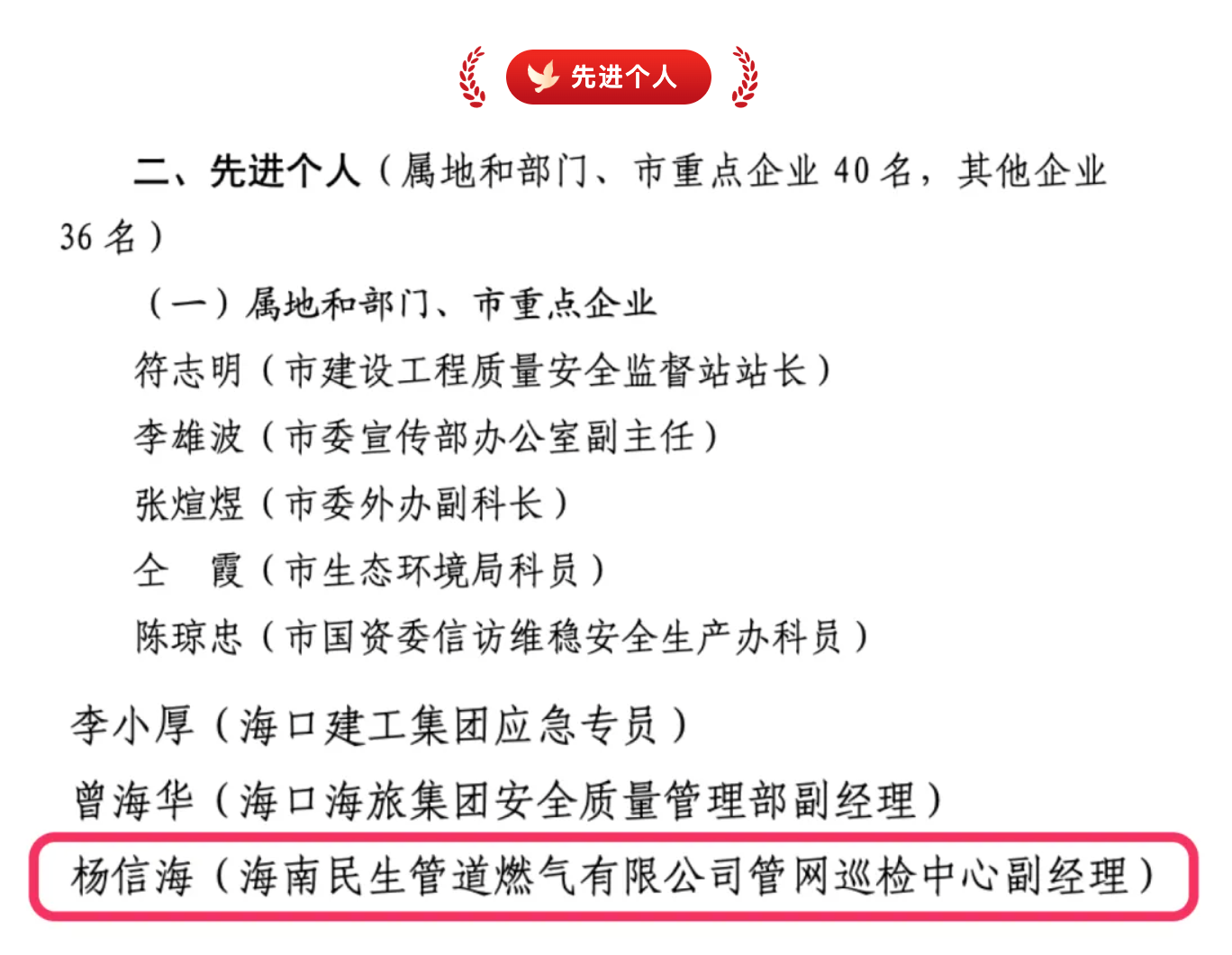近日,??谑蟹罏臏p災消防和安全生產(chǎn)委員會印發(fā)《關于 2024 年度安全生產(chǎn)先進單位和個人的通報》(海防安委【2025】2號),海南民生管道燃氣有限公司獲評“2024年度安全生產(chǎn)先進單位”,公司管網(wǎng)巡檢中心副經(jīng)理楊信海榮獲“安全生產(chǎn)先進個人”稱號。